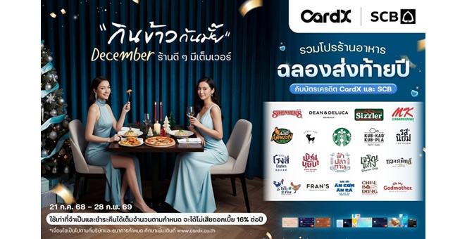 สำนักข่าวอีไฟแนนซ์ไทย- -18 ธ.ค. 68 15:13 น. CardX ผู้ให้บริการบัตรเครดิตและสินเชื่อบุคคลภายใต้กลุ่มเอสซีบีเอกซ์ เดินหน้าสร้างประสบการณ์ไลฟ์สไตล์ให้กับลูกค้าอย่างต่อเนื่อง ล่าสุดส่งแคมเปญ “กินข้าวกันมั๊ย December ร้านดี ๆ มีเต็มเวอร์” รวมโปรโมชันร้านอาหารและคาเฟ่ชื่อดังกว่า 20 แบรนด์ มอบความคุ้มค่าด้วยส่วนลดและเครดิตเงินคืนรวมสูงสุด 31%*/** สำหรับลูกค้าบัตรเครดิต CardX และ SCB ตอบโจทย์ทุกไลฟ์สไตล์การสังสรรค์ ไม่ว่าจะนัดเพื่อน ควงแฟน หรือฉลองกับครอบครัวในช่วงเทศกาลแห่งความสุข จากข้อมูลอินไซต์ของ CardX