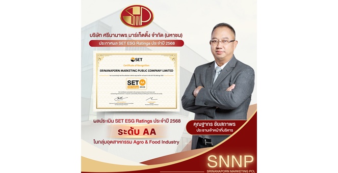 สำนักข่าวอีไฟแนนซ์ไทย- -18 ธ.ค. 68 15:59 น. ปรบมือดังๆ ให้กับความมุ่งมั่นของ บริษัท ศรีนานาพร มาร์เก็ตติ้ง จำกัด (มหาชน) หรือ (SNNP) ที่ล่าสุดคว้าคะแนน SET ESG Ratings ประจำปี 2568 ในระดับ “AA” (คะแนนรวม 80-89) ในกลุ่มเกษตรและอุตสาหกรรมอาหาร (Agro & Food Industry) จากตลาดหลักทรัพย์แห่งประเทศไทย ซึ่งเป็นการยกระดับ จากการประเมินครั้งแรกในปี 2567 จากเรตติ้ง “A” ไปสู่ระดับ “AA” ในปีนี้ได้อย่างรวดเร็ว แสดงให้เห็นถึงพัฒนาการอย่างเป็นรูปธรรม และเป็นเครื่องพิสูจน์ว่า SNNP ให้ความสำคัญในการดำเนินธุรกิจตามหลักการกำกับดูแลกิจการที่ดี