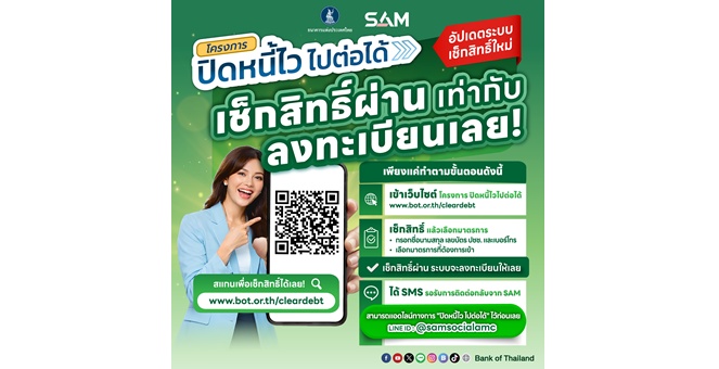 ทั้งนี้ ลูกหนี้สามารถตรวจสอบสิทธิ์เข้าร่วมโครงการได้ด้วยตนเอง แบบ “คลิกเดียวรู้ผลทันที” ผ่านช่องทางหลัก เว็บไซต์ ธนาคารแห่งประเทศไทย (ธปท.) www.bot.or.th/cleardebt และเว็บไซต์ บริษัท บริหารสินทรัพย์สุขุมวิท จำกัด www.sam.or.th เพียงกรอกข้อมูลส่วนตัว อาทิ ชื่อ-นามสกุล หมายเลขบัตรประชาชน หมายเลขโทรศัพท์ให้ครบถ้วน และหากลูกหนี้มีคุณสมบัติครบถ้วนตามเงื่อนไขทีกำหนด ระบบจะลงทะเบียนการเข้าร่วมโครงการให้โดยอัตโนมัติทันที! จากนั้นลูกหนี้จะได้รับการติดต่อผ่านทาง SMS จากธนาคารแห่งประเทศไทย และ SAM เพื่อยืนยันว่ามีคุณสมบัติตรงตามเงื่อนไขและสามารถเข้าร่วมโครงการได้ พร้อมระบุให้ลูกหนี้แอดไลน์ @samsocialamc และยืนยันตัวตน ซึ่งเป็นขั้นตอนสุดท้ายที่สำคัญ