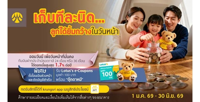 star_borderModal Upgrade Packageกรุงศรีชวนออมเงินเพื่อลูกได้ง่ายๆ กับบัญชีฝากประจำปลอดภาษี โอนเงินล่วงหน้าผ่าน krungsri app รับ Lotus’s e-Coupons 100 บาท และตุ๊กตาหมี6 มี.ค. 2569 10:22 น.