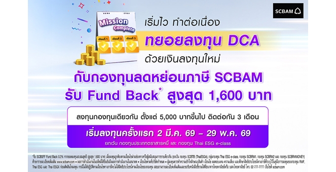 star_borderModal Upgrade PackageSCBAM ชวนทยอยวางแผนออมเพื่อเกษียณตั้งแต่ต้นปี มอบแคมเปญพิเศษ Fund Back สูงสุด 1,600 บาท(*) เมื่อลงทุน DCA ต่อเนื่อง 3 เดือนในกองทุนลดหย่อนภาษี เริ่มลงทุนครั้งแรก 2 มี.ค. 69 – 29 พ.ค. 692 Mar 2026 12:31
