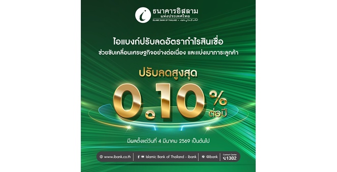 star_borderModal Upgrade Packageไอแบงก์ช่วยขับเคลื่อนเศรษฐกิจอย่างต่อเนื่อง และแบ่งเบาภาระลูกค้า ปรับลดอัตรากำไรสินเชื่อสูงสุด 0.10% ตรึงอัตราผลตอบแทนเงินฝาก ขานรับนโยบายรัฐหนุนฟื้นตัว27 ก.พ. 2569 14:20 น.