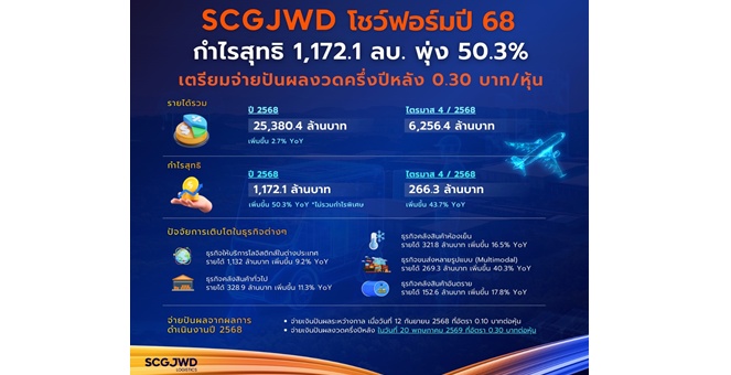 star_borderModal Upgrade PackageSJWD โชว์ฟอร์มปี 68 ทำกำไรสุทธิ 1,172.1 ล้านบาท พุ่งแรง 50.3% เตรียมจ่ายปันผลงวดครึ่งปีหลังอัตรา 0.30 บาทต่อหุ้น ชูกระแสเงินสดแข็งแกร่ง มุ่งลด SG&A คาด Q1/69 โตต่อเนื่อง25 ก.พ. 2569 13:48 น.