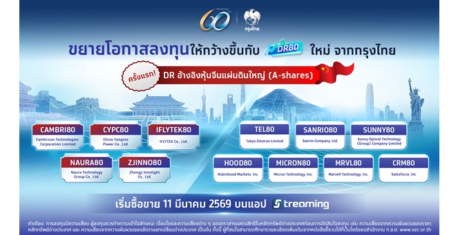 star_borderModal Upgrade Packageกรุงไทยเดินหน้าขยายโอกาสลงทุนต่างประเทศ เตรียมเปิดขาย 12 DR ตัวใหม่ อ้างอิงหุ้นจีน A-Shares และหุ้นเมกะเทรนด์ชั้นนำ ดีเดย์ 11 มี.ค.นี้25 ก.พ. 2569 09:26 น.