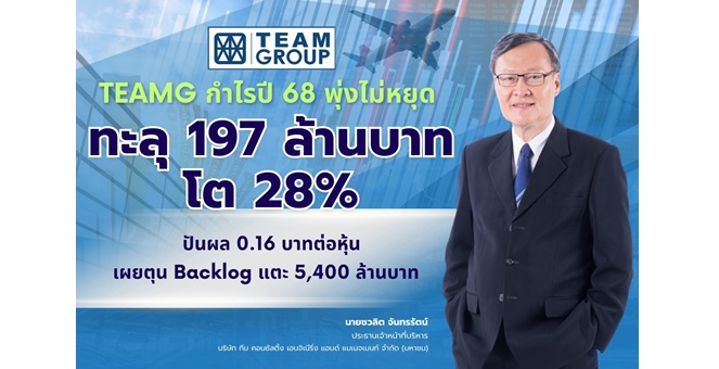 star_borderModal Upgrade PackageTEAMG กำไรพุ่งไม่หยุด ปี 68 ทะลุ 197 ล้านบาท โต 28% ปันผล 0.16 บาทต่อหุ้น เผยตุน Backlog แตะ 5,400 ล้านบาท25 ก.พ. 2569 10:06 น.