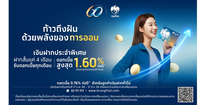 star_borderModal Upgrade Packageกรุงไทยฉลองครบรอบ 60 ปี เปิดตัวผลิตภัณฑ์เงินฝากประจำพิเศษ 4 เดือน ดอกเบี้ยสูงสุด 1.60% ต่อปี23 ก.พ. 2569 15:41 น.