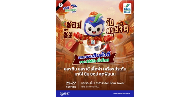 star_borderModal Upgrade PackageSME D Bank เชิญเที่ยว ‘SME D Market’ เดือน ก.พ.69 ฉลองตรุษจีน ระดมสุดยอดสินค้าดีจากเอสเอ็มอีไทย ชอปชิมจุใจกระตุ้นเศรษฐกิจสุดคึกคัก23 ก.พ. 2569 16:32 น.