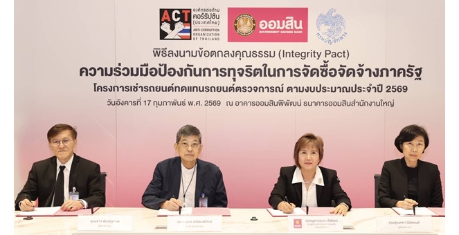 star_borderModal Upgrade Packageออมสิน ลงนามข้อตกลงคุณธรรม โครงการเช่ารถยนต์ทดแทนชุดเดิม ยกระดับความโปร่งใสจัดซื้อจัดจ้างภาครัฐ18 ก.พ. 2569 11:29 น.