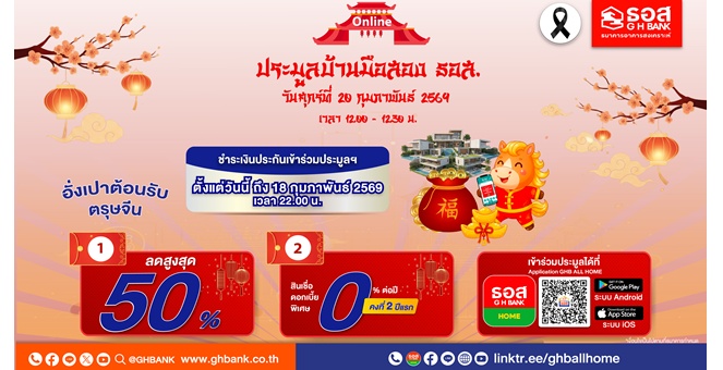 star_borderModal Upgrade Packageธอส. ชูดอกเบี้ย 0% ต่อปี พร้อมส่วนลดพิเศษสูงสุด 50% หนุนคนไทยมีบ้าน กับงานประมูลบ้านมือสองออนไลน์ พบกันวันที่ 20 กุมภาพันธ์ 256917 ก.พ. 2569 11:21 น.