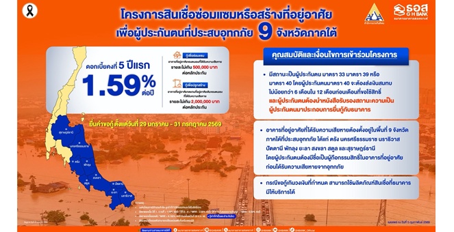 • ธอส. ร่วมกับ สปส. เดินหน้าฟื้นฟู 9 จังหวัดภาคใต้ จัดทำสินเชื่อซ่อมแซมหรือสร้างที่อยู่อาศัยเพื่อผู้ประกันตนที่ประสบอุทกภัย อัตราดอกเบี้ย 5 ปีแรกเพียง 1.59% ต่อปี ผ่อนต่ำสุดเริ่มต้นเดือนละ 1,500 บาทเท่านั้น!