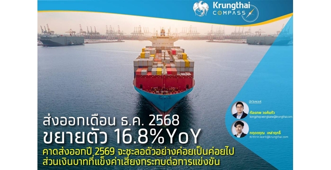 star_borderModal Upgrade PackageKrungthai COMPASS เผยส่งออกเดือน ธ.ค. 2568 ขยายตัว 16.8%YoY คาดส่งออกปี 2569 จะชะลอตัวอย่างค่อยเป็นค่อยไป ส่วนเงินบาทที่แข็งค่าเสี่ยงกระทบต่อการแข่งขัน26 ม.ค. 2569 16:07 น.