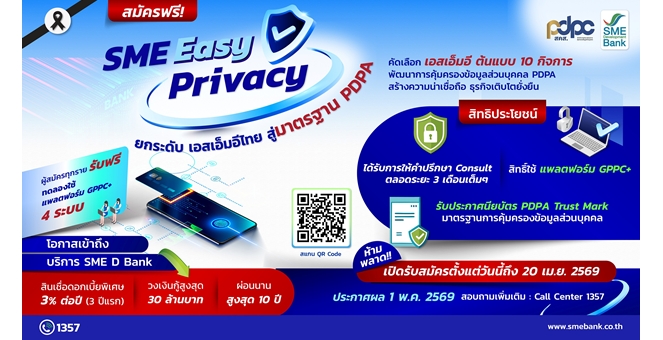 star_borderModal Upgrade PackageSME D Bank จับมือ สคส. เดินหน้าโครงการ “SME Easy Privacy” ปั้น 10 เอสเอ็มอีต้นแบบ PDPA ยกระดับธุรกิจสู่เศรษฐกิจดิจิทัล16 มี.ค. 2569 10:57 น.
