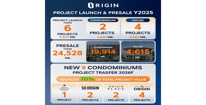 star_borderModal Upgrade Packageออริจิ้น โชว์ยอดขายบ้าน-คอนโดฯ ปี 2568 กว่า 24,500 ล้านบาท ปี 2569 จ่อโอนคอนโดฯเพิ่มอีก 9 โครงการ ตุน Backlog แล้วกว่า 70% ของมูลค่าโครงการ19 Jan 2026 13:57