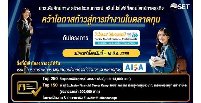 star_borderModal Upgrade Packageตลาดหลักทรัพย์ฯ เปิดโครงการ New Breed 2026 รุกปั้นนักการเงินรุ่นใหม่ มอบทุนสอบ AISA ฟรี14 ม.ค. 2569 14:42 น.