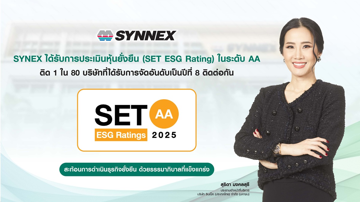 star_borderModal Upgrade PackageSYNEX ได้รับประเมินหุ้นยั่งยืน (SET ESG Ratings) ในระดับ AA ติด 1 ใน 80 บริษัทที่ได้รับการจัดอันดับเป็นปีที่ 8 ติดต่อกัน สะท้อนการดำเนินธุรกิจยั่งยืน ด้วยธรรมาภิบาลที่แข็งแกร่ง19 ธ.ค. 2568 17:56 น.