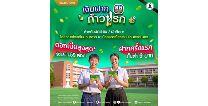 star_borderModal Upgrade Packageธ.ก.ส. ออก“เงินฝากก้าวแรก” ต่อยอดการออมโรงเรียนธนาคารและโรงเรียนเกษตรธนากร ฝาก 9 เดือน รับดอกเบี้ยสูงสุดร้อยละ 1.59 ต่อปี15 ธ.ค. 2568 08:12 น.