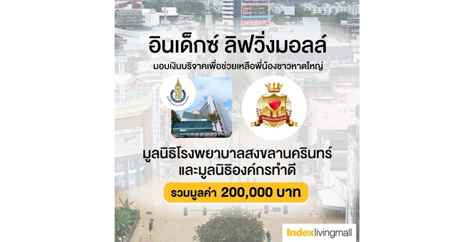• ‘อินเด็กซ์ ลิฟวิ่งมอลล์’ ร่วมมือกับ ‘กรมการค้าภายใน-กระทรวงพาณิชย์’ รวมใจไทย ฟื้นแดนใต้ ส่งต่อพลังน้ำใจ ‘เพื่อนช่วยเพื่อน เราจะไม่ทิ้งกัน’ เคียงข้างพี่น้องผู้ประสบอุทกภัยหาดใหญ่