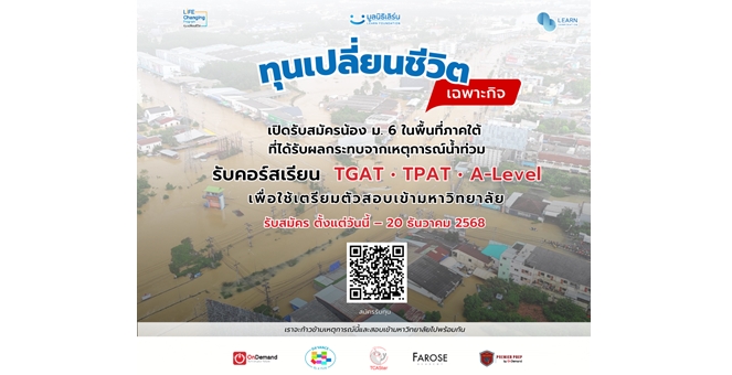 star_borderModal Upgrade Packageทุนเปลี่ยนชีวิต เปิดรอบเฉพาะกิจ! ช่วยนักเรียน ม.6 ที่รับผลกระทบอุทกภัยใต้ ได้เดินหน้าตามเส้นทางการศึกษาที่ตั้งใจ8 ธ.ค. 2568 14:23 น.