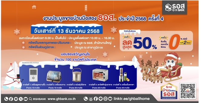 star_borderModal Upgrade Packageโอกาสสุดท้ายปี 68 !! ธอส. คัดบ้านมือสองทั่วไทยจัดประมูลใหญ่ ลดราคาสูงสุด 50% พร้อมโปรโมชันพิเศษ พบกันวันเสาร์ที่ 13 ธันวาคม 25688 ธ.ค. 2568 12:17 น.