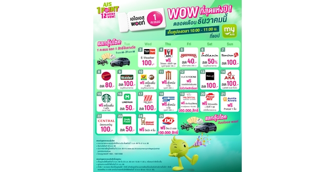 star_borderModal Upgrade PackageAIS มอบสุขสุดว้าว! ส่งท้ายปี ตลอดเดือนธันวาคม ใช้ เอไอเอส พอยท์ 1 คะแนน แลกรับฟรี! คูปองกว่า 20 แบรนด์ดัง พร้อมลุ้นโชค และสิทธิพิเศษมากมาย ที่แอป myAIS3 ธ.ค. 2568 14:19 น.