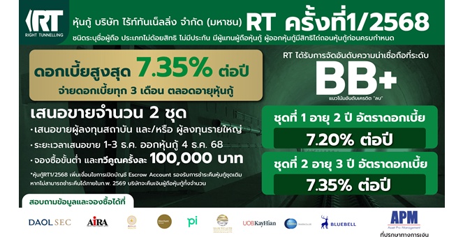 star_borderModal Upgrade Packageหุ้นกู้ RT ครั้งที่ 1/68 วันแรก สถาบัน - รายใหญ่ สนใจจองซื้อต่อเนื่อง1 ธ.ค. 2568 13:01 น.