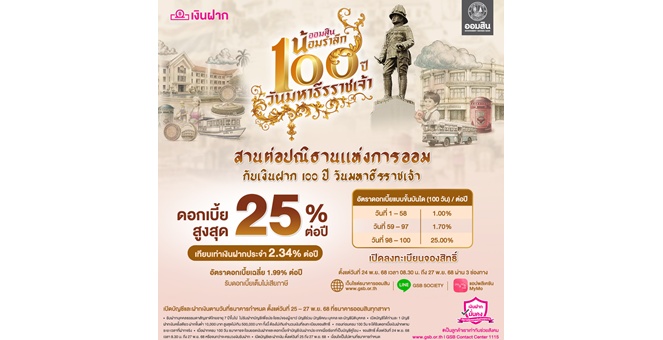 star_borderModal Upgrade Packageออมสิน ออกเงินฝากส่งเสริมการออม น้อมรำลึกในพระมหากรุณาธิคุณ รัชกาลที่ 6 “เงินฝาก 100 ปี วันมหาธีรราชเจ้า” ฝาก 100 วัน ดอกเบี้ย Step up สูงสุด 25% ต่อปี จองสิทธิ์ 24 พ.ย. นี้21 Nov 2025 15:21