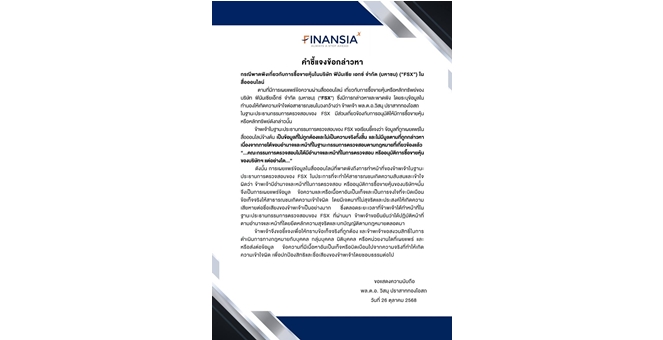 • คำชี้แจงข้อกล่าวหา กรณีพาดพิงเกี่ยวกับการซื้อขายหุ้นในบริษัท ฟินันเซีย เอกซ์ จำกัด (มหาชน) (“FSX”) ในสื่อออนไลน์