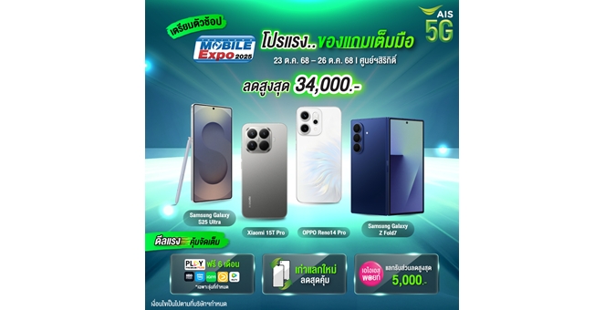 star_borderModal Upgrade PackageAIS ระเบิดโปรแรงส่งท้ายปี “Thailand Mobile Expo 2025” ลดเดือด! สูงสุด 34,000 บาท พร้อมฉลอง 35 ปี ใช้ 1 พอยท์ แลกรับส่วนลดแก็ดเจ็ตสุดคุ้ม!21 Oct 2025 17:20