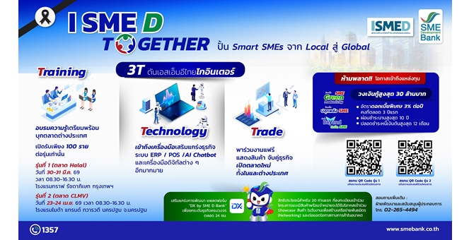 • SME D Bank จับมือ ISMED ปั้น Smart SMEs ยกระดับธุรกิจโกอินเตอร์ เสิร์ฟโปรแกรม 3T คู่เติมทุนสินเชื่อดอกเบี้ยพิเศษ เปิดรับรุ่นที่ 1 บุกตลาด Halal