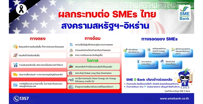 star_borderModal Upgrade PackageSME D Bank ชี้สงครามสหรัฐฯ-อิหร่าน กระทบเอสเอ็มอีไทย ต้นทุนพุ่ง-เชื่อมั่นถอย ประกาศพาถึงสินเชื่อดอกเบี้ยต่ำ ช่วยลดภาระการเงิน ยกระดับใช้เทคโนโลยีมุ่งสู่พลังงานสีเขียว9 มี.ค. 2569 14:54 น.