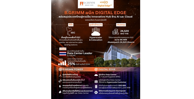 star_borderModal Upgrade PackageDigital Edge B.Grimm (TH) เปิดตัวศูนย์ดาต้าเซ็นเตอร์ไฮเปอร์สเกล และ AI ในไทย มูลค่าโครงการ 24,520 ล้านบาทในเขต EEC9 มิ.ย. 2568 14:22 น.
