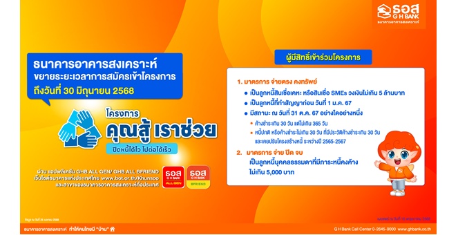 star_borderModal Upgrade Packageธอส. ขยายเวลาช่วยคนไทยรักษาบ้านของตนเอง เปิดลงทะเบียน “โครงการคุณสู้ เราช่วย” ถึงวันที่ 30 มิถุนายน 256816 พ.ค. 2568 13:39 น.