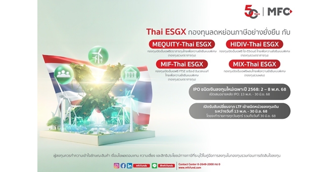 star_borderModal Upgrade PackageMFC เปิดตัว 4 กองทุน `Thai ESGX` ขาย IPO 2–8 พ.ค. 68 ตอบโจทย์ทุกการลงทุนทุกด้านความยั่งยืนในหุ้นไทย29 เม.ย. 2568 14:13 น.
