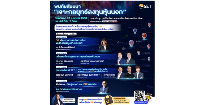 star_borderModal Upgrade Packageตลาดหลักทรัพย์ฯ ชวนฟังสัมมนา “เจาะลึกกลยุทธ์ลงทุนหุ้นนอก” อาทิตย์ 27 เม.ย. นี้24 เม.ย. 2568 10:31 น.
