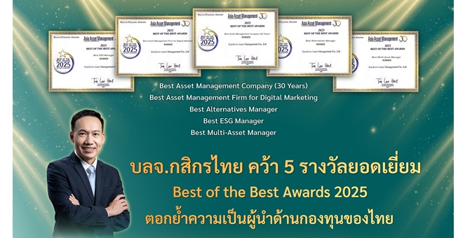 star_borderModal Upgrade Packageบลจ.กสิกรไทย คว้า 5 รางวัลยอดเยี่ยม Best of the Best Awards 2025 ตอกย้ำความเป็นผู้นำด้านกองทุนของไทย18 เม.ย. 2568 15:28 น.