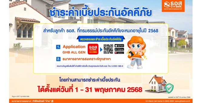 star_borderModal Upgrade Packageธอส. อำนวยความสะดวกให้ลูกค้า ต่ออายุประกันอัคคีภัย ชำระค่าเบี้ยได้ง่ายๆ ตั้งแต่วันที่ 1–31 พฤษภาคม 2568 ผ่าน ธอส.ทุกสาขาทั่วประเทศ และ Application : GHB ALL GEN16 เม.ย. 2568 13:41 น.