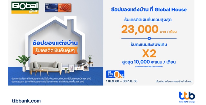 star_borderModal Upgrade Packageบัตรทีทีบี โกลบอลเฮ้าส์ จัดแคมเปญพิเศษ เพื่อคนรักบ้าน รับเครดิตเงินคืนรวมสูงสุด 23,000 บาท ต่อเดือน พร้อมรับคะแนนสะสมพิเศษ 2 เท่า11 เม.ย. 2568 15:42 น.