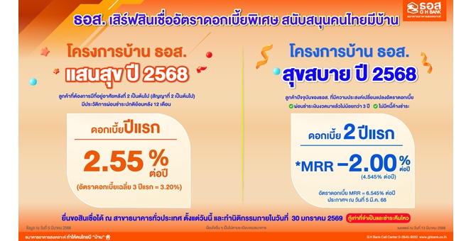 star_borderModal Upgrade Packageธอส. เสิร์ฟสินเชื่ออัตราดอกเบี้ยพิเศษ เริ่มต้น 2.55% ต่อปี สานต่อนโยบายรัฐ สนับสนุนคนไทยมีบ้าน พร้อมช่วยแบ่งเบาภาระการผ่อนชำระเงินงวดของลูกค้า13 มี.ค. 2568 15:26 น.