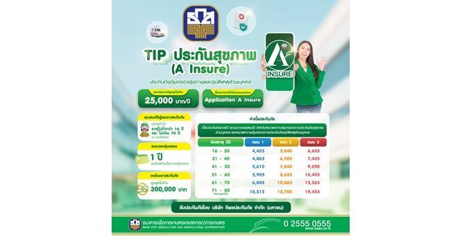 star_borderModal Upgrade Packageธ.ก.ส. เปิดตัวประกันสุขภาพและอุบัติเหตุส่วนบุคคล คุ้มครองสูงสุด 300,000 บาท ค่าเบี้ยประกันเริ่มตั้งแต่ 4,435 บาท ซื้อง่ายตลอด 24 ชม. ผ่านแอปพลิเคชัน A Insure7 มี.ค. 2568 12:18 น.
