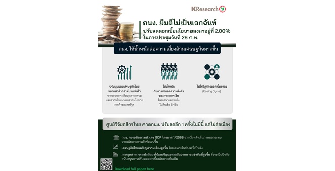 star_borderModal Upgrade Packageศูนย์วิจัยกสิกรฯ เผย กนง.มีมติไม่เป็นเอกฉันท์ปรับดอกเบี้ยนโยบายลงมาอยู่ที่ 2.00% ในการประชุมวันที่ 26 ก.พ.26 ก.พ. 2568 17:35 น.