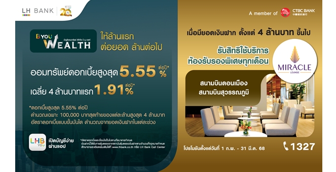 star_borderModal Upgrade PackageLH Bank มอบประสบการณ์สุดเอ็กซ์คลูซีฟ สำหรับลูกค้า B-You Wealth รับสิทธิ์พักก่อนบินเข้าใช้บริการห้องรับรอง Miracle Lounge ทุกเดือน ที่สนามบินดอนเมือง และสนามบินสุวรรณภูมิ19 ก.พ. 2568 12:28 น.