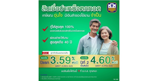 star_borderModal Upgrade Packageธ.ก.ส. เสิร์ฟสินเชื่อบำเหน็จตกทอด เพื่อผู้เกษียณอายุ ดอกเบี้ยปีแรกเพียง 3.59% กู้ได้สูงสุด 100% ของบำเหน็จตกทอด ให้ผ่อนชำระนาน 40 ปี16 ม.ค. 2568 16:24 น.