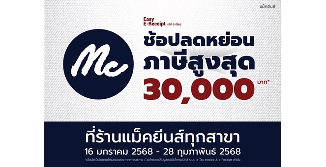 star_borderModal Upgrade Package“แม็คยีนส์” ร่วม “Easy E-Receipt 2568” ชวนช้อป ลดหย่อนภาษีสูงสุด 30,000 บาท ทุกสาขาทั่วไทย15 ม.ค. 2568 15:30 น.