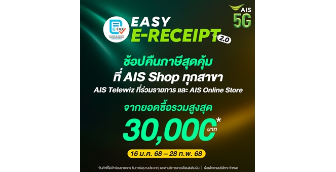 star_borderModal Upgrade PackageAIS ขานรับมาตรการ “Easy E-Receipt 2.0” หนุนเศรษฐกิจปี 2568 ช้อปลดหย่อนภาษีสูงสุด 30,000 บาท พร้อมจัดเต็มสิทธิพิเศษสุดคุ้ม15 ม.ค. 2568 16:11 น.